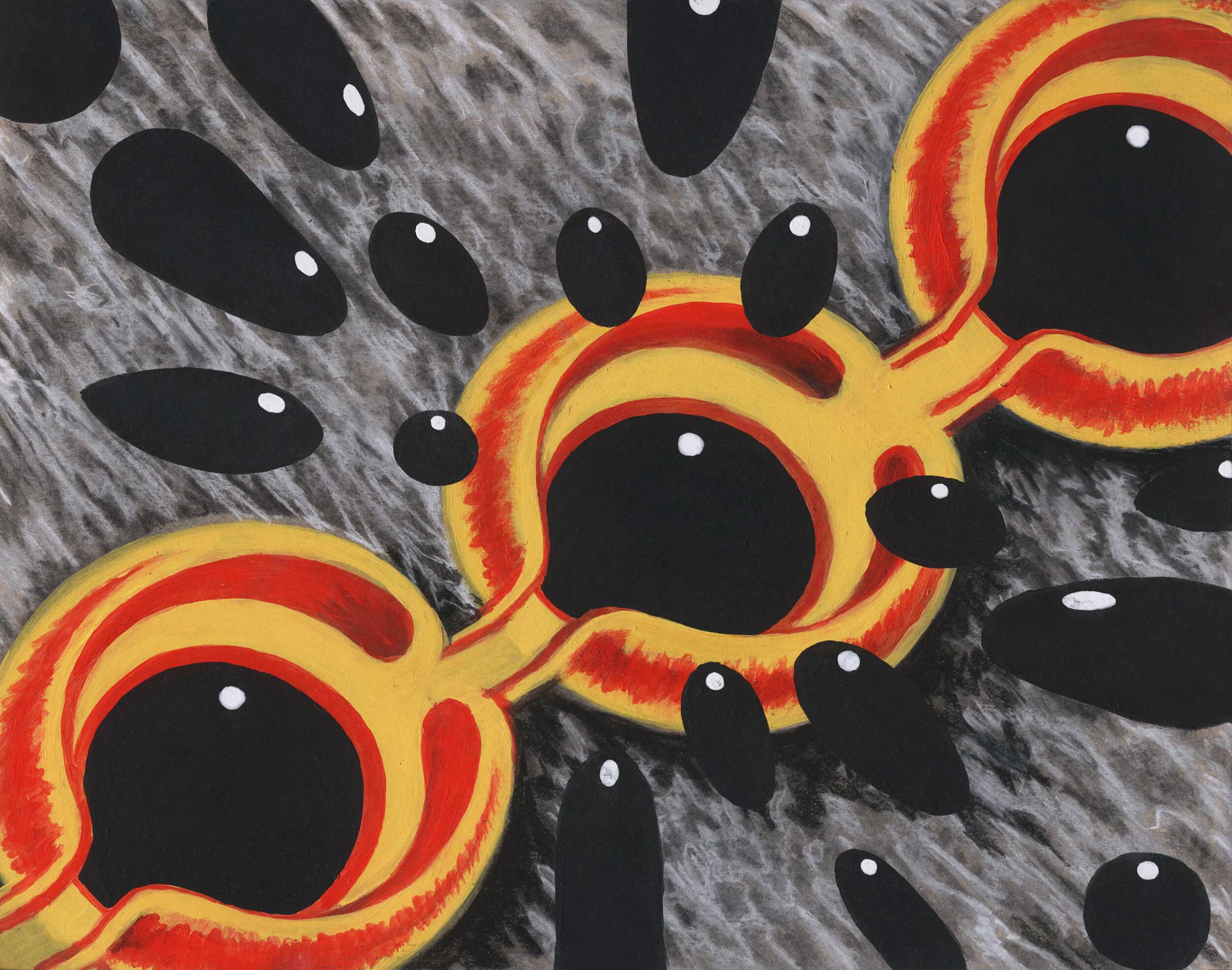 The premise forTape was to work on a portion of the panel, then tape it and seal the edges with a matte medium, so no paint could bleed. The piece was passed between each other and the process of taping and sealing the edges was repeated many times. When the piece was fully taped it was finished, and we proceeded to unveil the big reveal to see what we had unknowingly been creating.