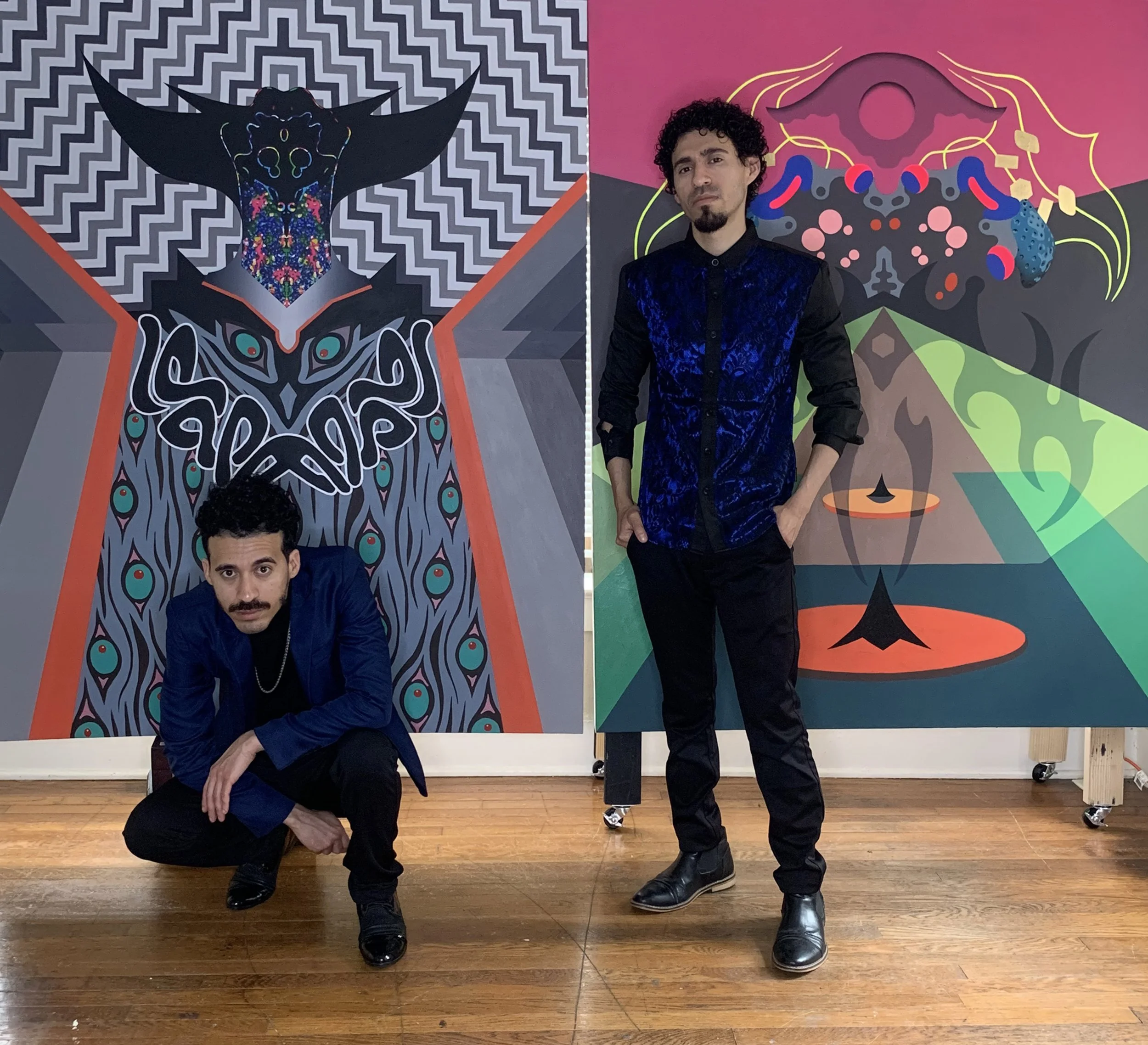 Parentheses 1 & 2 stand as the beginning and end of Cadejo. We built a large custom double-sided painting easel. We stretched two large canvases on each side. This way of operating allowed for each piece to progress simultaneously and kept our momentum flowing. To further push the momentum, we added the notion of time. One day, we set timers and worked timed intervals, rotating the easel after each session. By the end of the day, both canvases were fully covered with marks, capturing our attempts to fully conceptualize ideas.